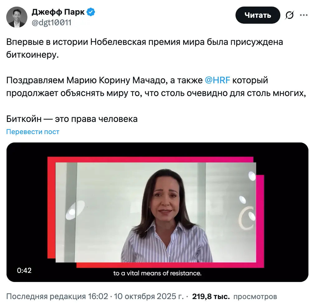Впервые в истории Нобелевская премия мира была присуждена стороннику биткоина.