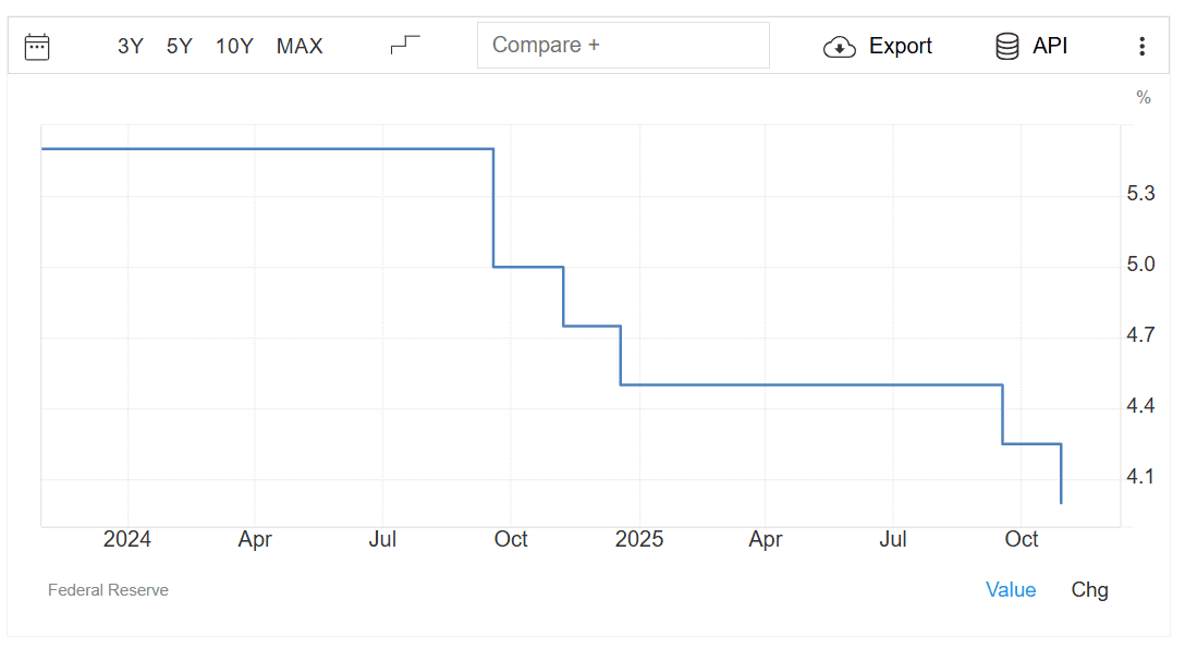 29 октября 2025 года состоялось заседание Федерального комитета по операциям на открытом рынке ФРС США (FOMC). По его итогам регулятор принял решение снизить процентную ставку на 0,25% — до 3,75%-4%.