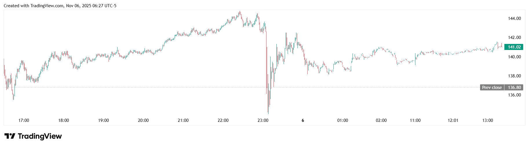 Вечером 5 ноября 2025 года цена акций Robinhood резко упала, но затем восстановилась на премаркете. На суточном чарте прирост составляет более 4%: