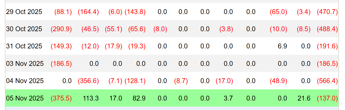 Серия, начавшаяся 29 октября, к настоящему моменту привела к оттоку более $2,04 млрд. Наибольший вывод произошел во вторник, когда инвесторы забрали $566 млн после предыдущих сессий с $470 млн, $488 млн и $191 млн.