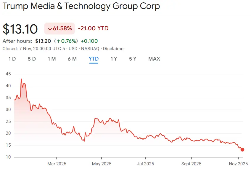 Акции Trump Media and Technology Group испытывают трудности с ростом в этом году. Источник: Google Finance.
