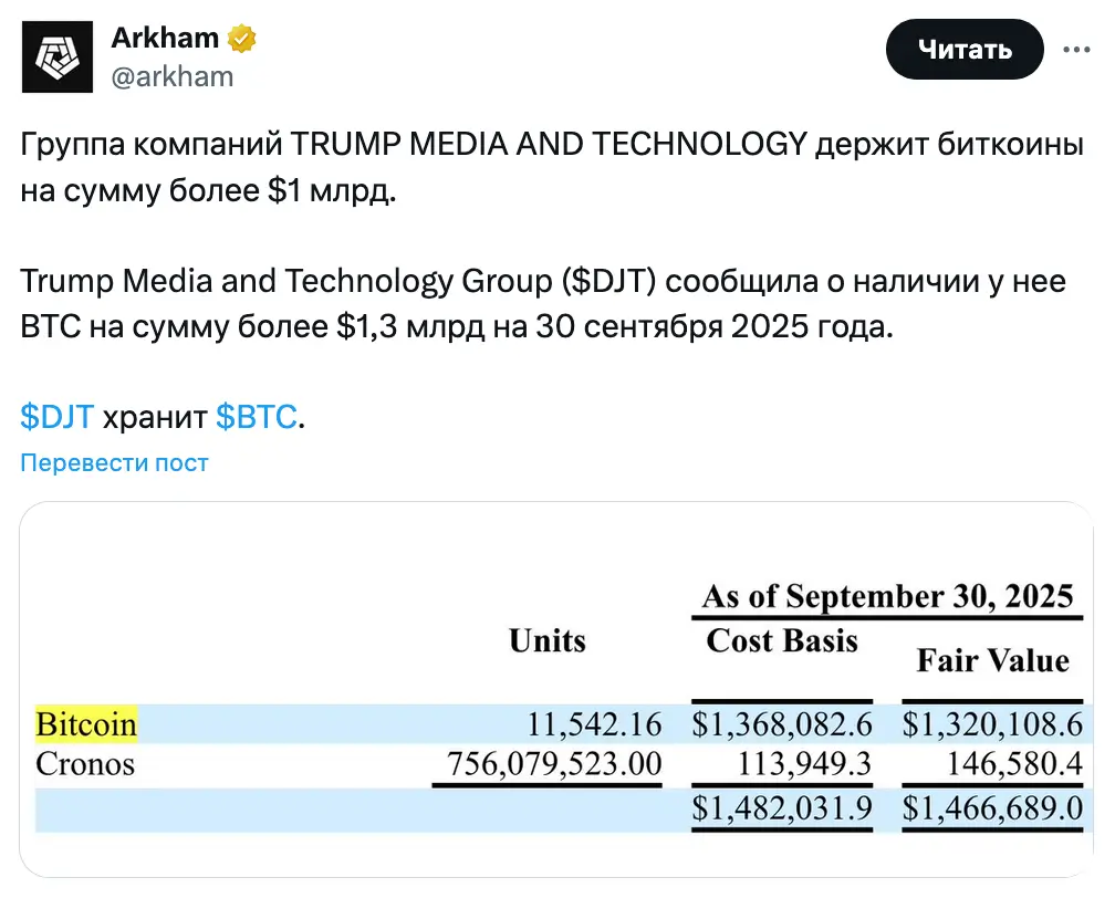 Trump Media сообщила, что на 30 сентября ее запас биткоинов составлял 11,542 BTC. Компания впервые объявила о начале покупок биткоинов в конце июля и указала в отчете планы по приобретению дополнительного количества, а также рассмотрению возможности «приобретения других аналогичных криптовалют».