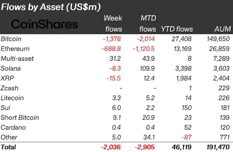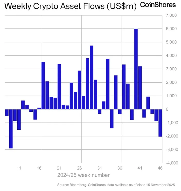 С 10 по 15 ноября инвесторы вывели $2 млрд из криптовалютных биржевых продуктов (ETP). Это крупнейший отток с февраля 2024 года, говорится в отчете CoinShares.