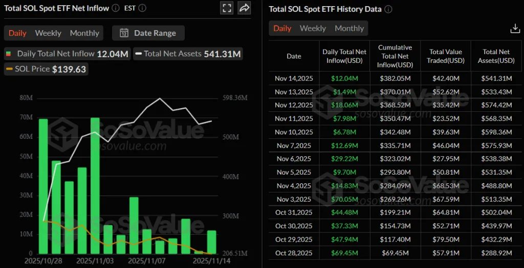 Однако ETF на базе Solana и XRP не фиксировали оттока средств за все время своего существования. 14 ноября приток в SOL-инструменты составил $12,04 млн, а в XRP-фонды — $243,05 млн.