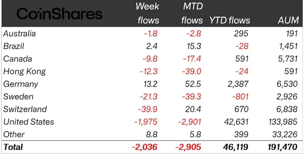 На Соединенные Штаты пришлось 97% оттока, или $1,97 млрд, тогда как Германия стала исключением с притоком в $13,2 млн, против общемирового тренда.