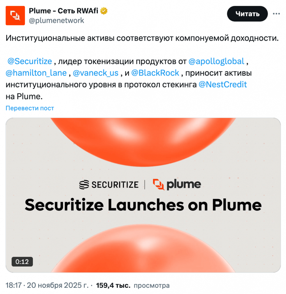 Компания Plume объявила в среду, что платформа токенизации Securitize, поддерживаемая BlackRock и Morgan Stanley, планирует размещать активы институционального уровня в стейкинг-протоколе Nest от Plume.