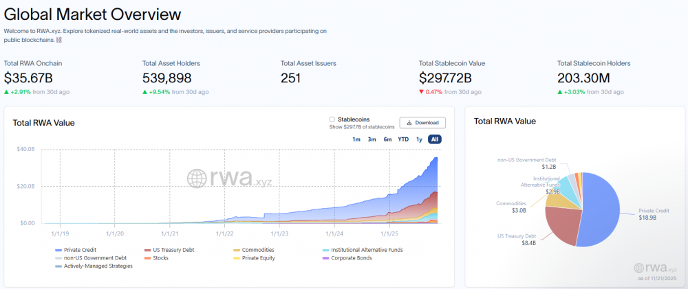 Согласно данным RWA.xyz, в блокчейн размещено реальных активов на сумму более $35 млрд, которые распределены между более чем 539 тысячами держателей.
