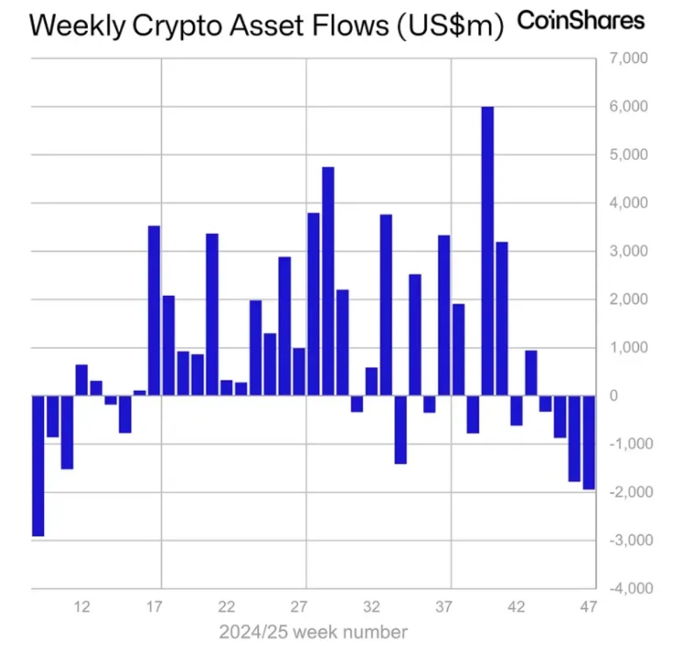 Согласно отчету аналитиков CoinShares, с 15 по 21 ноября отток средств из криптовалютных инвестиционных продуктов достиг 1,94 миллиарда долларов США. Негативная динамика сохраняется уже четвертую неделю подряд.