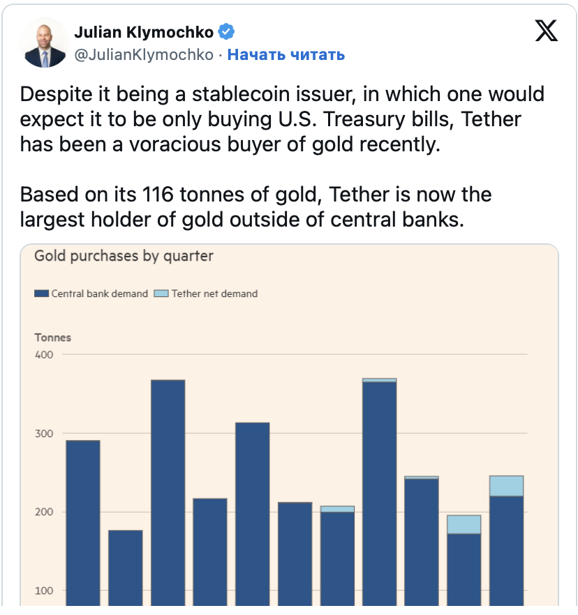 Однако отчет инвестиционного банка Jefferies выявил неожиданного лидера в этом секторе. В третьем квартале Tether приобрела 26 тонн золота. Это больше, чем купил любой центральный банк мира за аналогичный период.