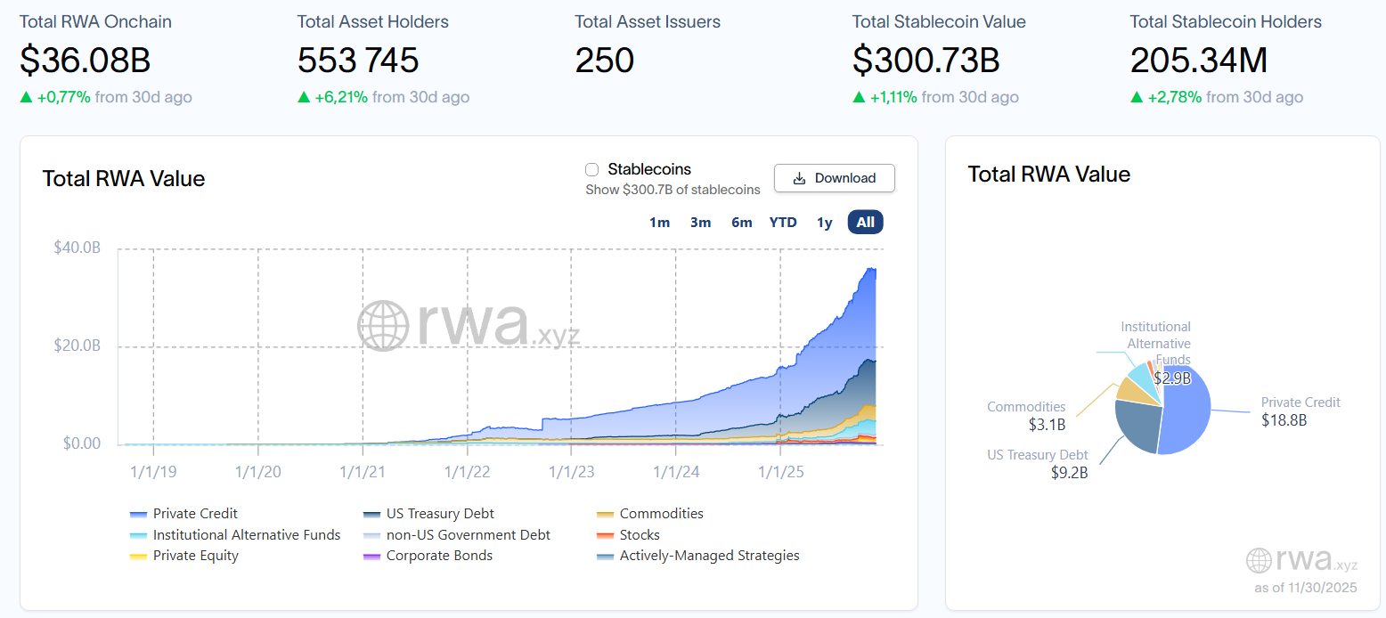 Токенизация стала одной из ключевых тем в финансовом секторе. По данным на момент публикации, общая капитализация рынка составляет $36 млрд. Крупнейшие сегменты — цифровые частные кредиты и казначейские облигации США.