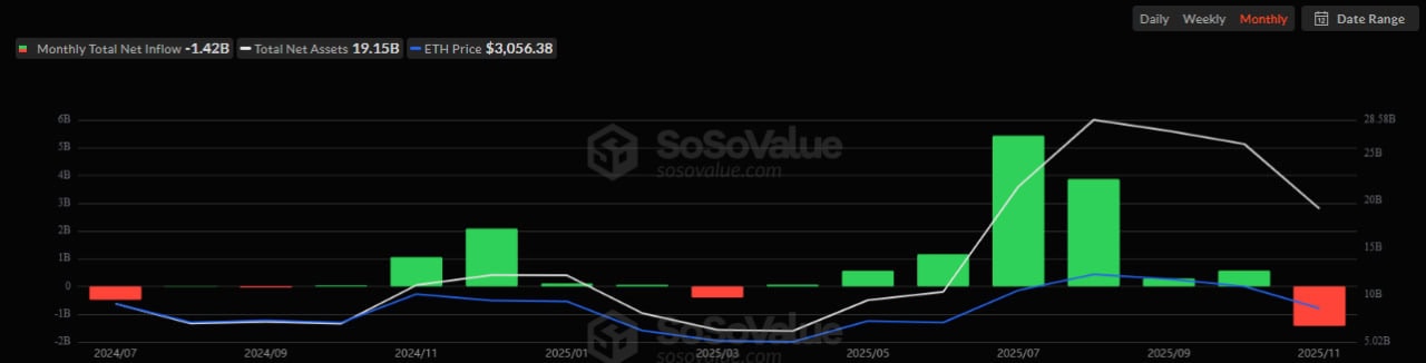 Аналогичная динамика зафиксирована и в Ethereum-ETF. Всего за месяц из этих фондов вывели более $1,42 млрд — худший показатель за всю историю существования инструментов.