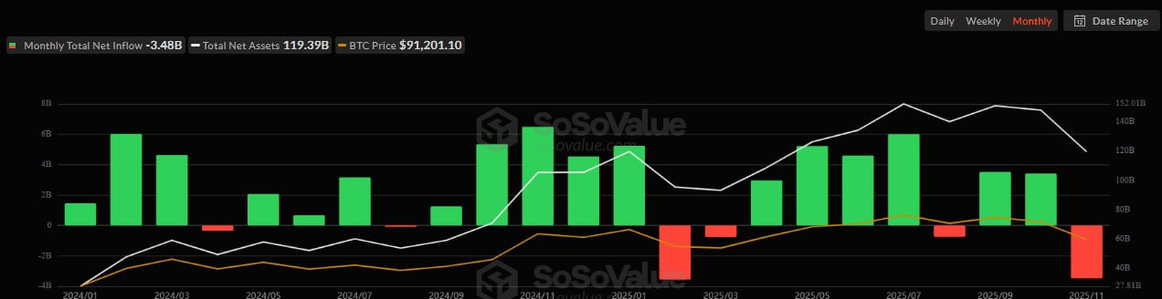 - Из биткоин-ETF вывели более $3,48 млрд в ноябре 2025 года.