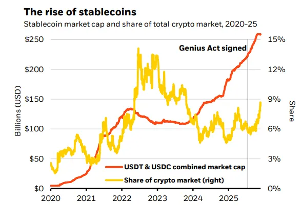 В отчете упоминается принятие в США закона GENIUS Act, который создал первую нормативную базу для платежных «стабильных монет». Эмитентам разрешили использовать маркетинговые вознаграждения, что сделало их конкурентами банковских депозитов и фондов денежного рынка.