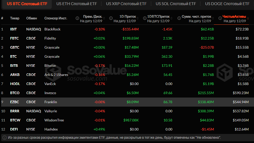 Лидером среди ориентированных на цифровое золото фондов стал FBTC от Fidelity, который привлек $199 млн.