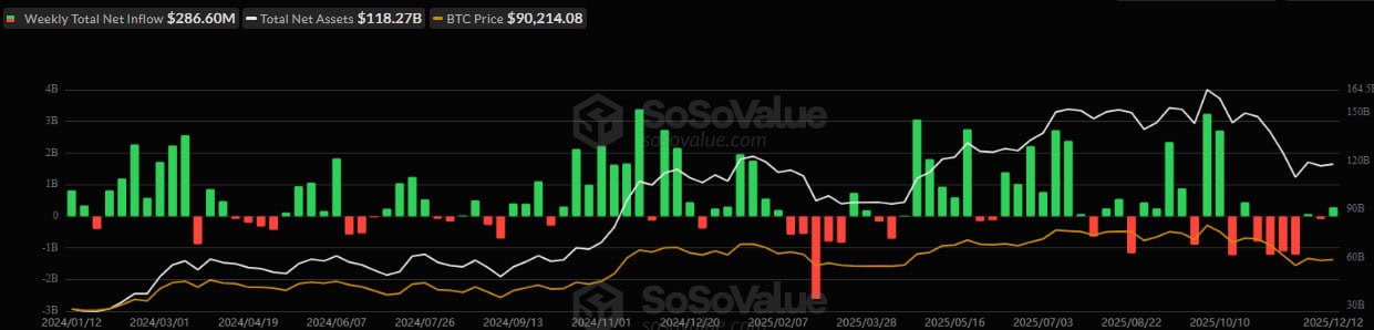 - С 8 по 12 декабря приток в биткоин-ETF достиг $286,6 млн.