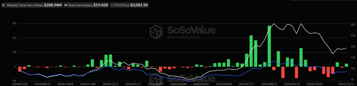 Ethereum-ETF за этот же период пополнились на $208,9 млн. Основная часть средств поступила 9 декабря — $177,6 млн. Однако в последние два дня недели фонды потеряли в общей сложности более $60 млн.
