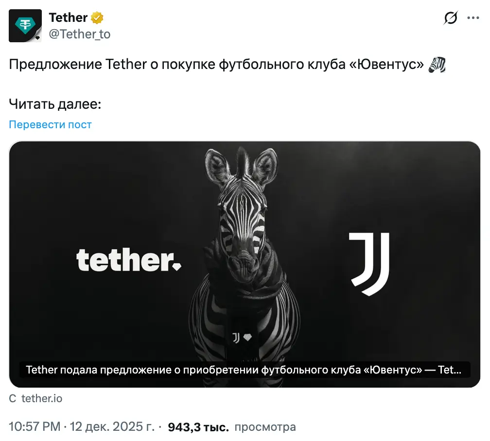 Компания‑эмитент стейблкоина Tether (USDT) выступила с предложением о полном приобретении итальянского футбольного клуба «Ювентус».