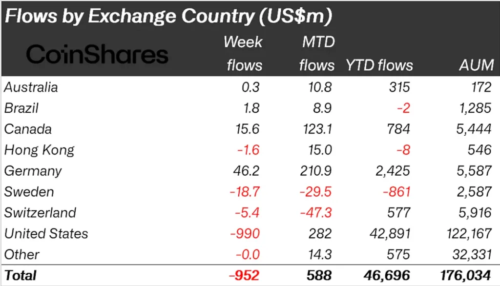 Основной отток средств пришелся на США — $990 млн. Однако потери немного компенсировали позитивные настроения участников рынка в Канаде ($46,2 млн) и Германии ($15,6 млн).