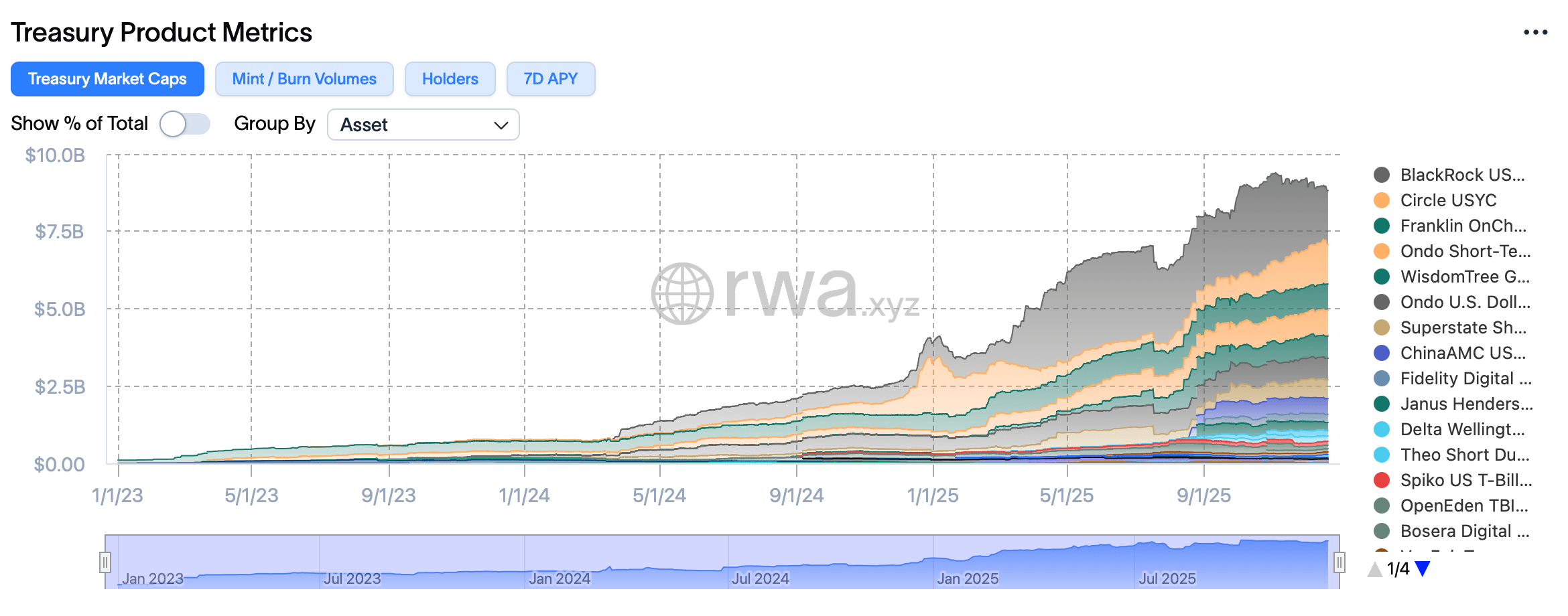 Стейблкоины оставались тяжеловесом токенизации, составляя примерно 300 миллиардов долларов в стоимости и более 200 миллионов держателей. Но помимо токенов, привязанных к доллару, инвесторы в 2025 году стремились к доходным RWAs, которые казались знакомыми, прозрачными и полезными в блокчейне.