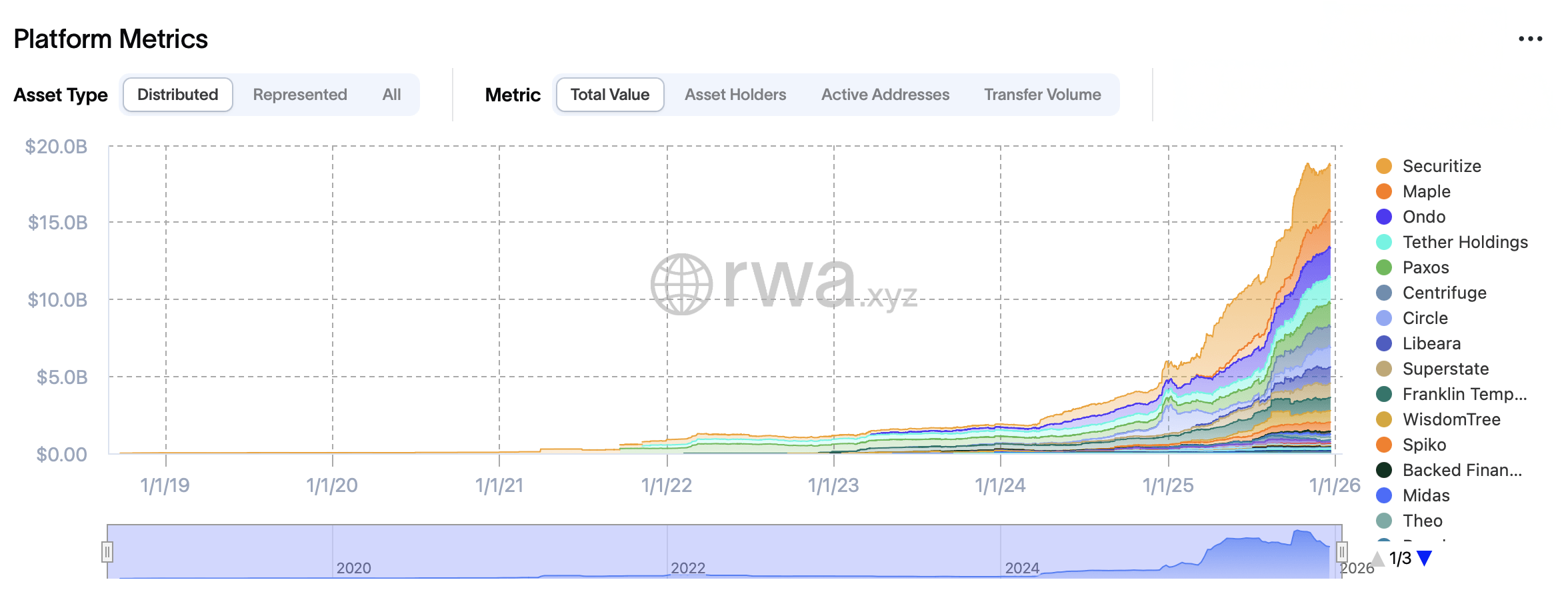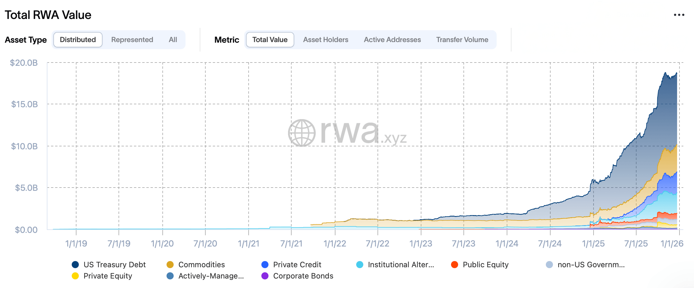 На высоком уровне вселенная токенизированных активов завершила 2025 год с явным разделением. Распределенные RWAs — токены, которые могут свободно перемещаться между кошельками и протоколами — достигли почти 19 миллиардов долларов в стоимости, в то время как представленные активы, заблокированные на платформах эмитентов, возвышались над ними, приближаясь к 400 миллиардам долларов. Дисбаланс имел меньшее значение, чем тренд: мобильность, а не просто ярлыки токенов, все больше определяла, какие продукты привлекали устойчивый спрос.
