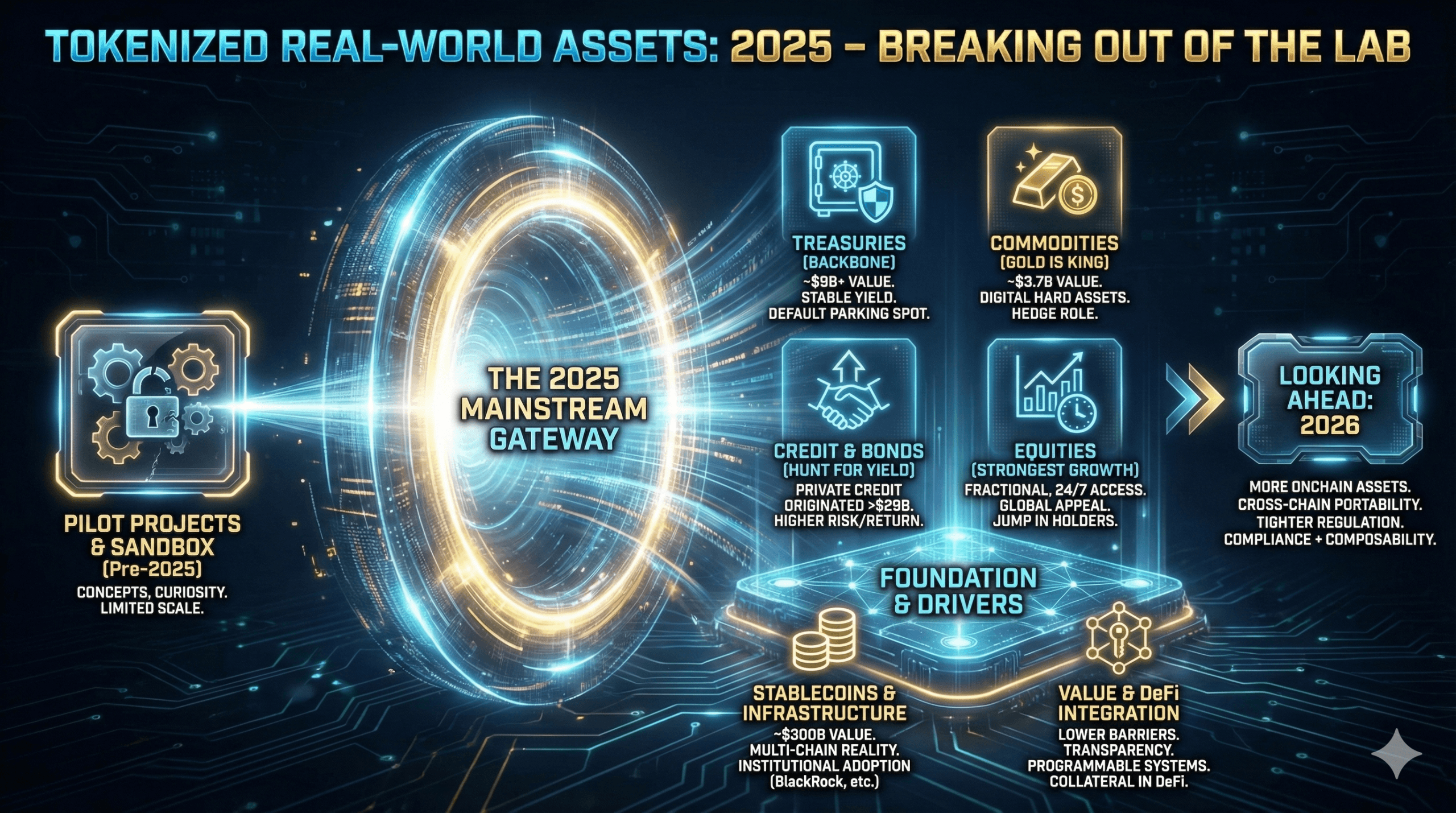 Токенизированные реальные активы провели 2025 год, избавляясь от ярлыка “пилотный проект” и твердо шагнув в финансовый мейнстрим, при этом казначейские обязательства, кредиты, товары и акции нашли реальное применение в блокчейне.