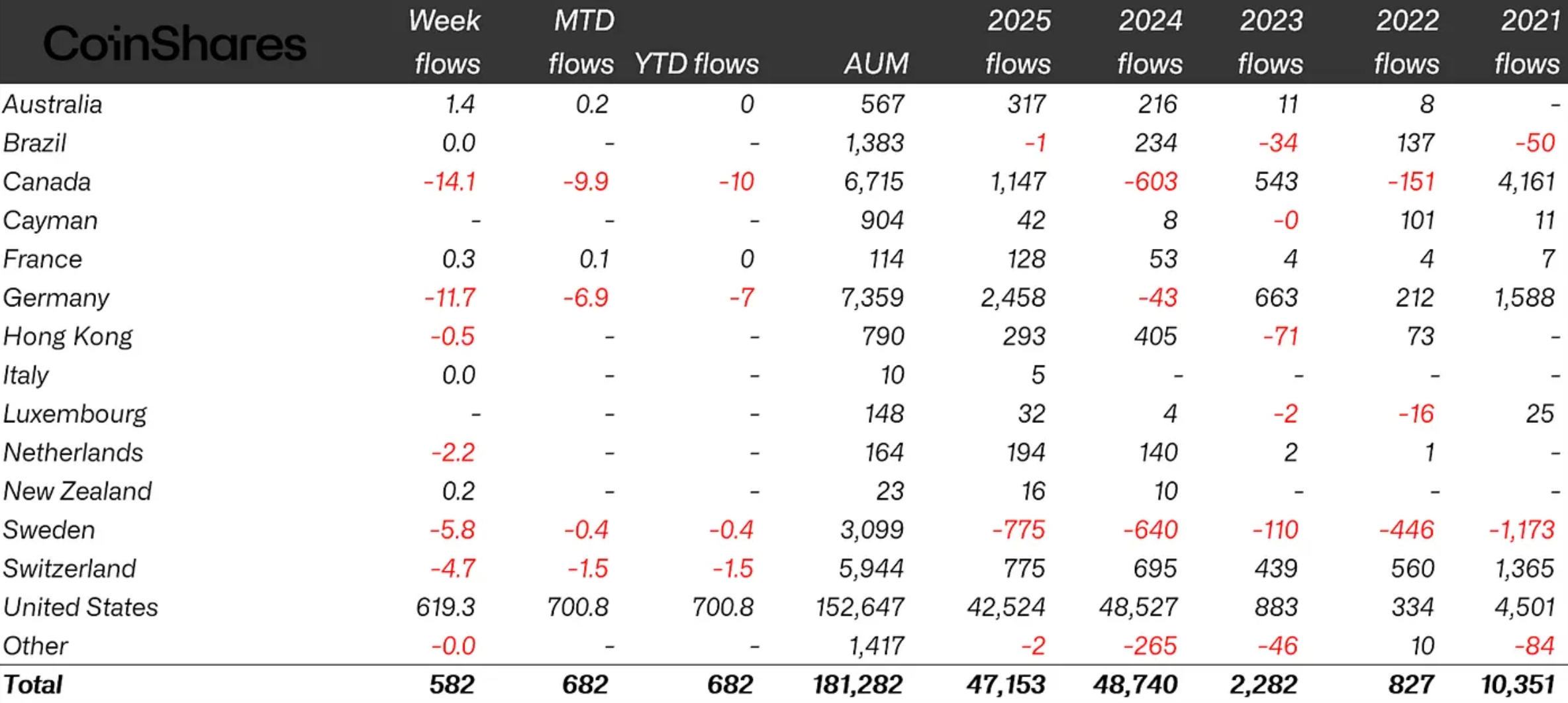 Приток средств по странам за последние пять лет (в миллионах долларов США). Источник: CoinShares