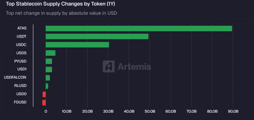 По данным Artemis, ведущий на рынке стейблкоин USDT, выпущенный Tether, привлек 49 000 000 000 долларов, а USDC от Circle Internet (CRCL), занимающий второе место, - около 31 000 000 000 долларов.
