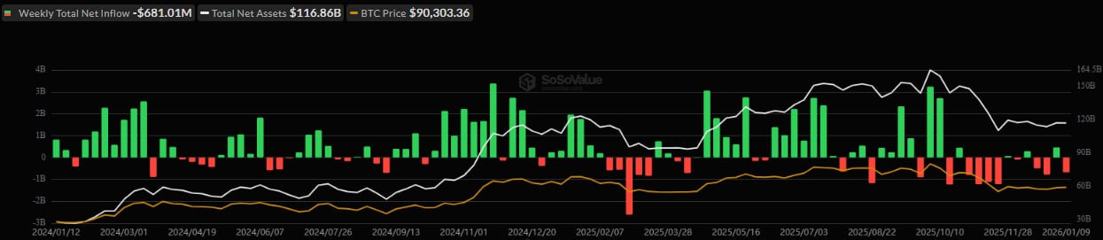 - С 5 по 9 января спотовые биткоин-ETF зафиксировали отток капитала на $681 млн.