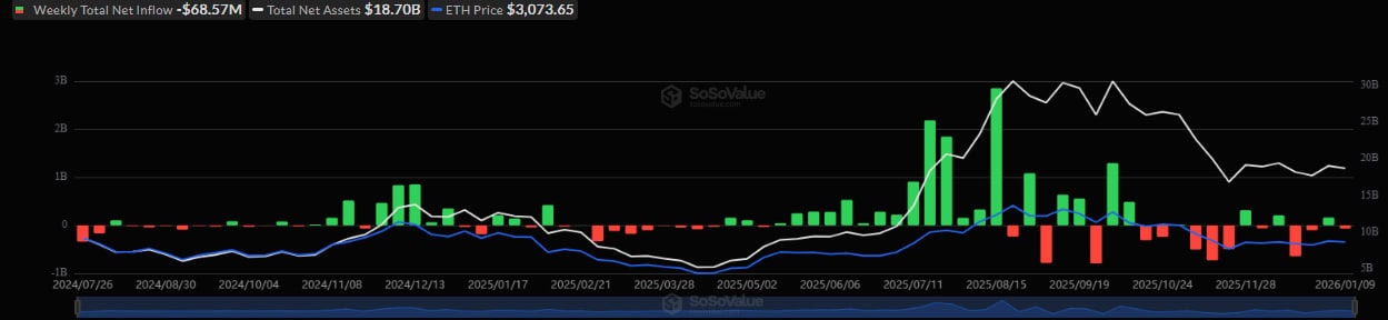 Похожая ситуация наблюдается и в секторе Ethereum-ETF. В течение той же недели отток составил $68,57 млн. При этом в четверг и пятницу (5-6 января) фонды еще демонстрировали приток капитала — $168,13 млн и $114,74 млн соответственно. В последние три дня недели в фондах продолжилась негативная тенденция.