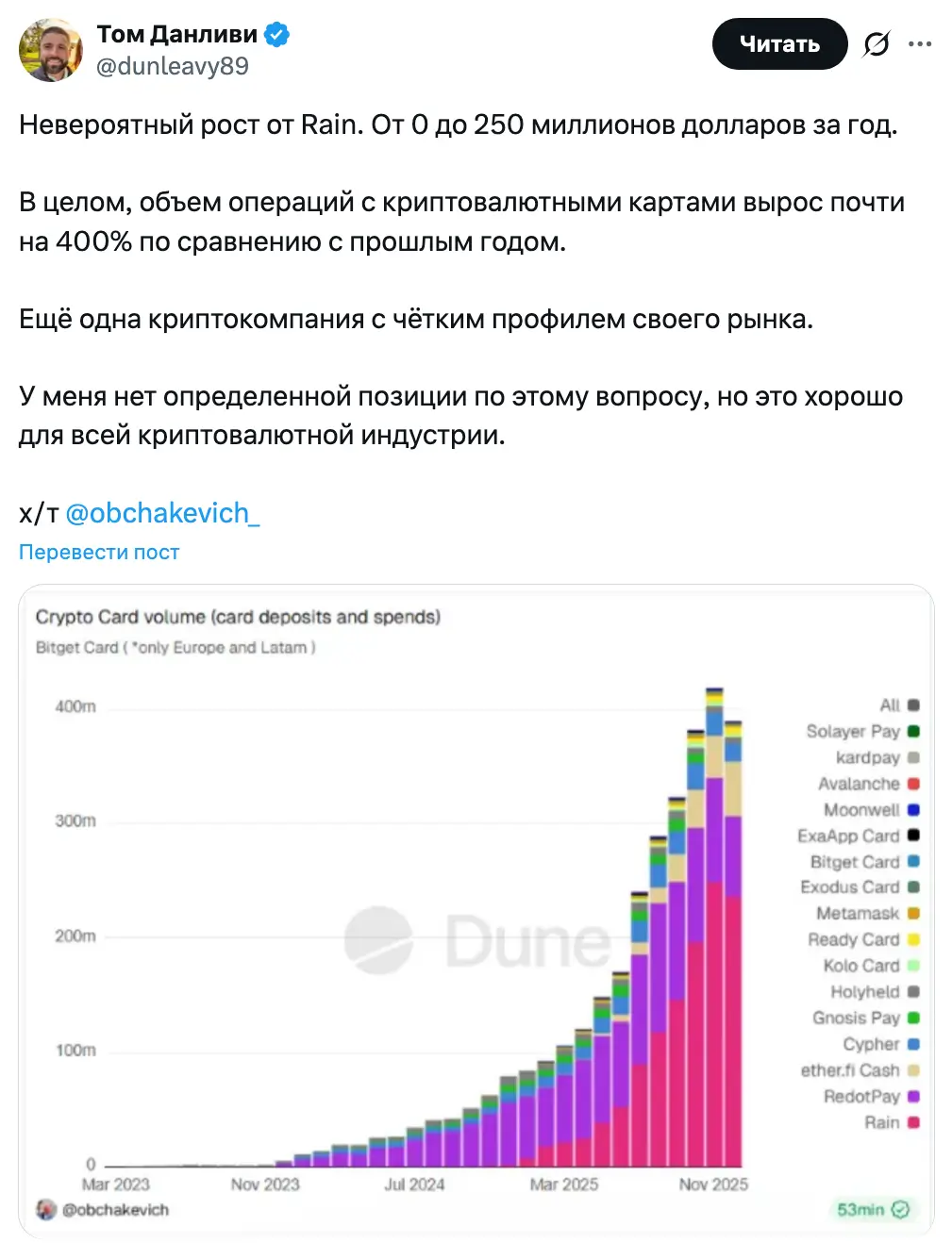 Это заявление прозвучало после того, как стартап Rain завершил раунд финансирования на $250 млн. За 2025 год компания увеличила число активных карт в 30 раз, а годовой объем платежей — почти в 40 раз, войдя в число самых быстрорастущих финтех‑компаний мира.