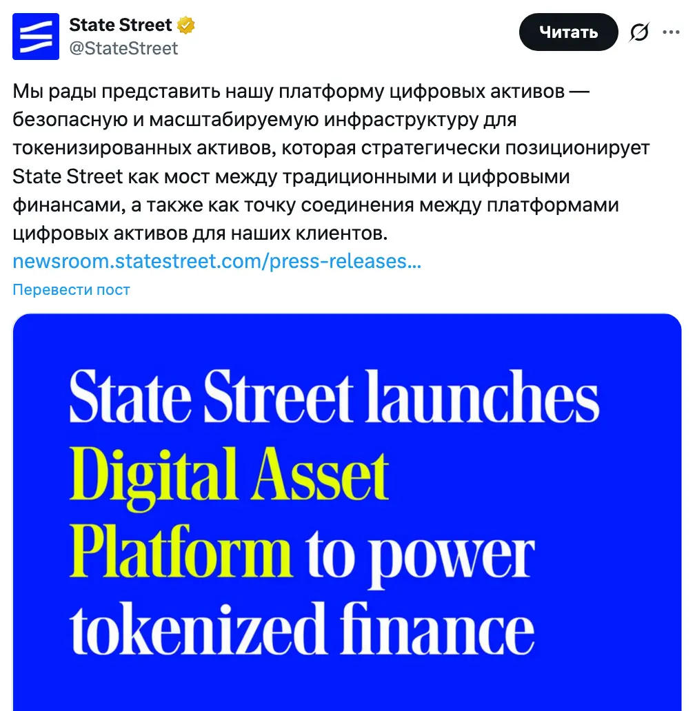 State Street управляет активами на сумму $5,4 трлн. Компания уже несколько лет осваивает сферу цифровых активов, и в 2025 году активность заметно возросла.