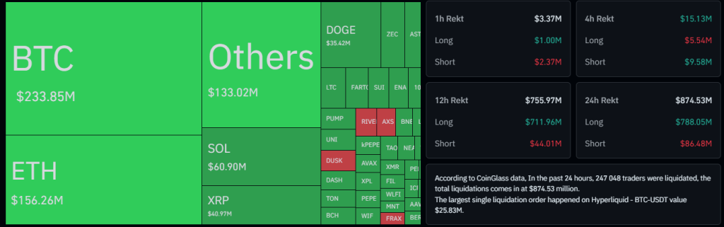 Однако текущая коррекция цены привела к волне ликвидаций. По данным CoinGlass, за сутки объем принудительно закрытых позиций на крипторынке достиг $874,53 млн. Основной удар пришелся на трейдеров, игравших на повышение: убытки в лонгах составили $788,05 млн.