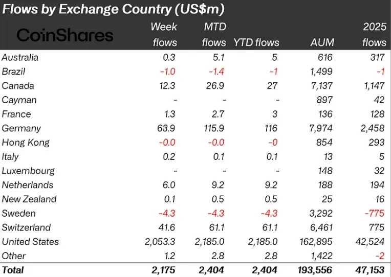 В региональном разрезе доминируют США с притоком $2,05 млрд. Следом со значительным отрывом идут Германия ($63,9 млн), Швейцария ($41,6 млн) и Канада ($12,3 млн).