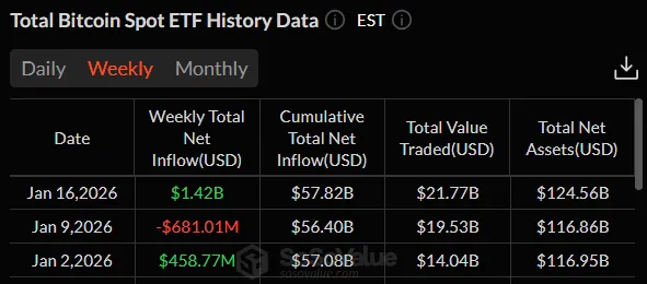 За прошлую неделю чистый приток капитала в американские спотовые биткоин-ETF составил $1,42 млрд. Это максимальный недельный показатель с октября.