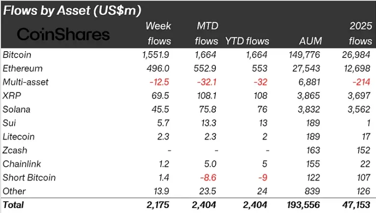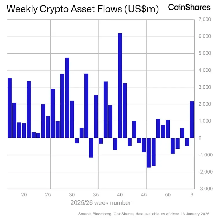 С 10 по 16 января поступления в криптовалютные инвестиционные продукты составили $2,17 млрд. Это рекордный показатель с октября 2025 года, говорится в отчете CoinShares.