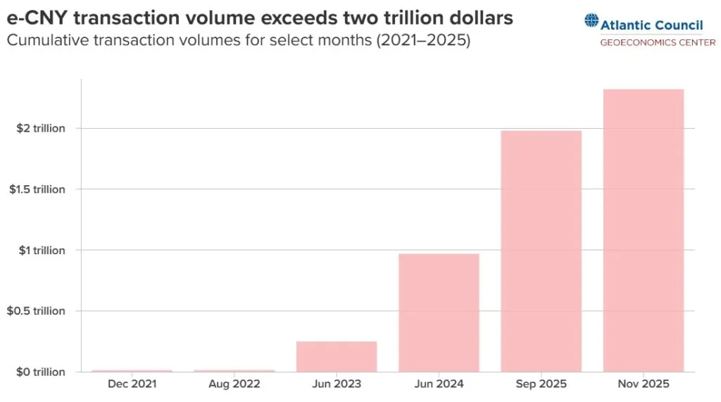 По данным Atlantic Council, объем транзакций в цифровом юане вырос более чем на 800% с момента запуска пилота в 2023 году и превысил $2,3 трлн.