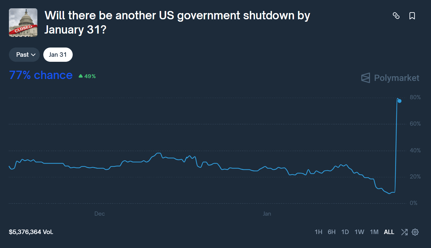 Участники торгов на платформе Polymarket оценивают вероятность повторной приостановки работы правительства США до конца января в 77%. За последние 24 часа показатель вырос примерно на 67%, что стало одним из самых резких движений на политических рынках платформы.