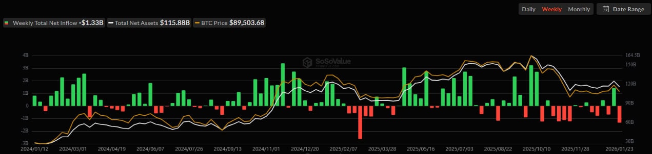 - Спотовые биткоин-ETF потеряли $1,33 млрд в период с 20 по 23 января 2026 года.