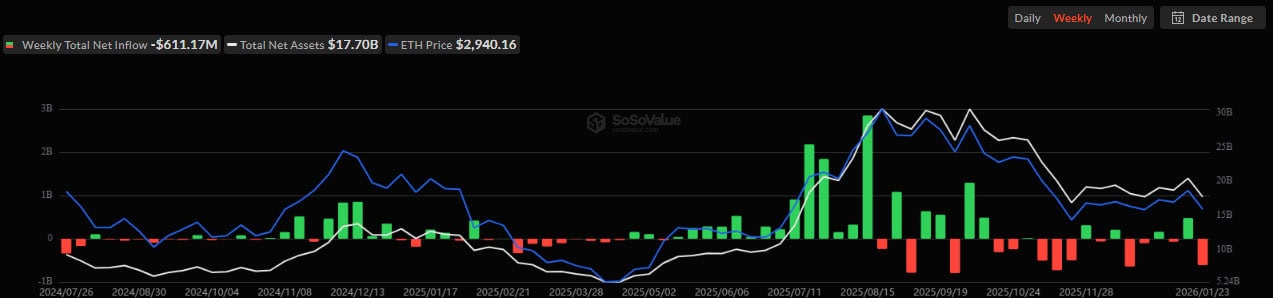 Ethereum-ETF за тот же период потеряли $612 млн. Наибольший отток наблюдался 21 января — более $297 млн. Днем ранее из фондов вывели почти $230 млн, а 22 и 23 января — по $42 млн соответственно.