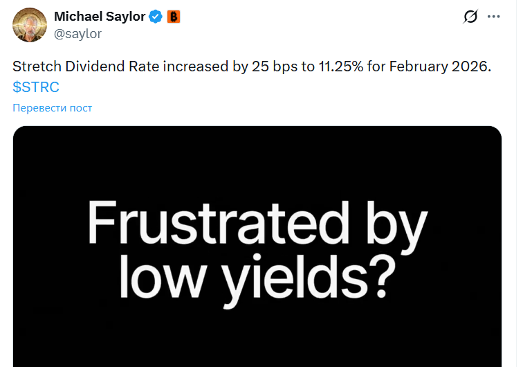 Основатель Strategy Майкл Сэйлор сообщил, что дивидендный доход по акциям STRC увеличился на 25 базисных пунктов и составил 11,25% годовых для выплаты в феврале.