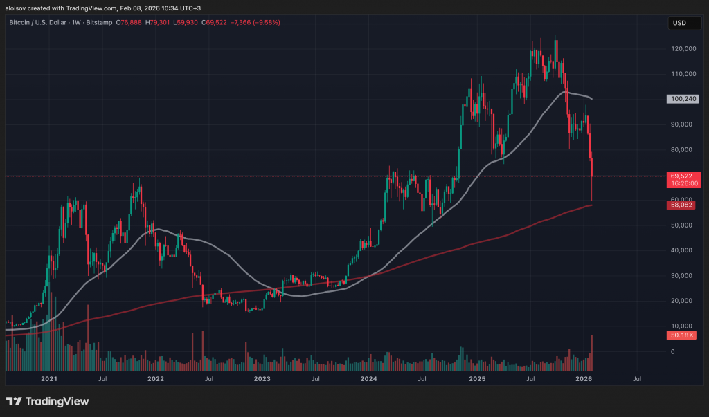 Биткоин обвалился ниже $60 000 впервые с ноября 2024 года, продемонстрировав первое в истории дневное падение более чем на $10 000. Коррекция составила 52,5% от октябрьского максимума в $126 080, что превзошло по масштабу даже обвалы во время пандемии COVID-19 и краха биржи FTX. Криптовалютный рынок потерял триллион долларов капитализации за три недели, а индекс страха и жадности опустился до исторического минимума в 5 баллов.