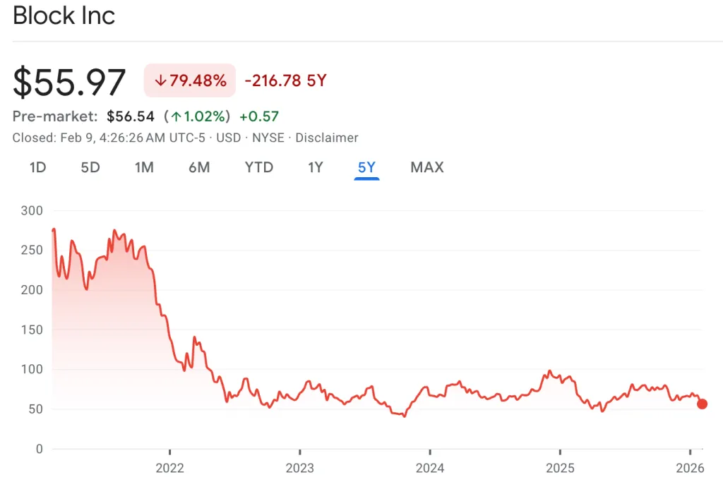 За год акции Block подешевели примерно на 37%, с начала января — на 13%. Пятничную сессию бумаги завершили коррекционным ростом до $55,97 (+4,85%).