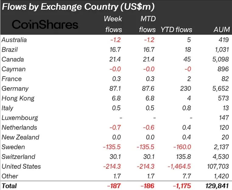 Инвесторы из Германии вложили в криптофонды $87,1 млн, из Швейцарии — $30,1 млн. Приток также зафиксирован в Канаде ($21,4 млн) и Бразилии ($16,7 млн).
