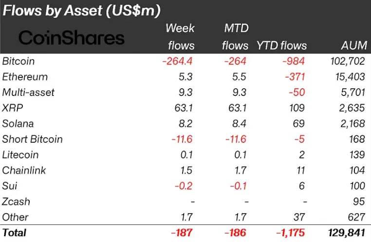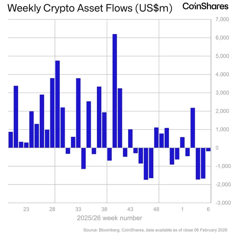 Отток средств из криптовалютных инвестиционных продуктов замедлился до $187 млн. Аналитики CoinShares расценивают снижение темпов вывода как сигнал о вероятном завершении рыночной коррекции.