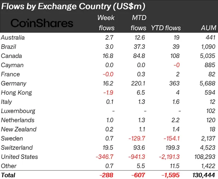 Американские инвесторы вывели $347 млн. Игроки из Европы и Канады использовали падение цен для покупок и вложили $59 млн. Больше всего средств поступило из Швейцарии ($19,5 млн), Канады ($16,8 млн) и Германии ($16,2 млн).