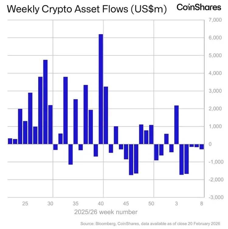 С 16 по 20 февраля инвесторы вывели $288 млн из криптовалютных фондов. Отток средств продолжается пятую неделю подряд, согласно отчету CoinShares.