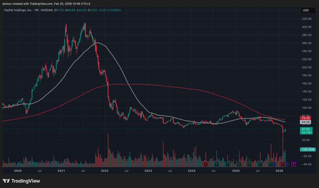 Рынок отреагировал моментально: акции PayPal (PYPL) в тот же день выросли на 6,74% и завершили торги на уровне $47,02. Впрочем, это не меняет общей картины — с начала года бумаги потеряли почти 20%, а от пика 2021 года, когда котировки превышали $300, они обвалились на 85%.