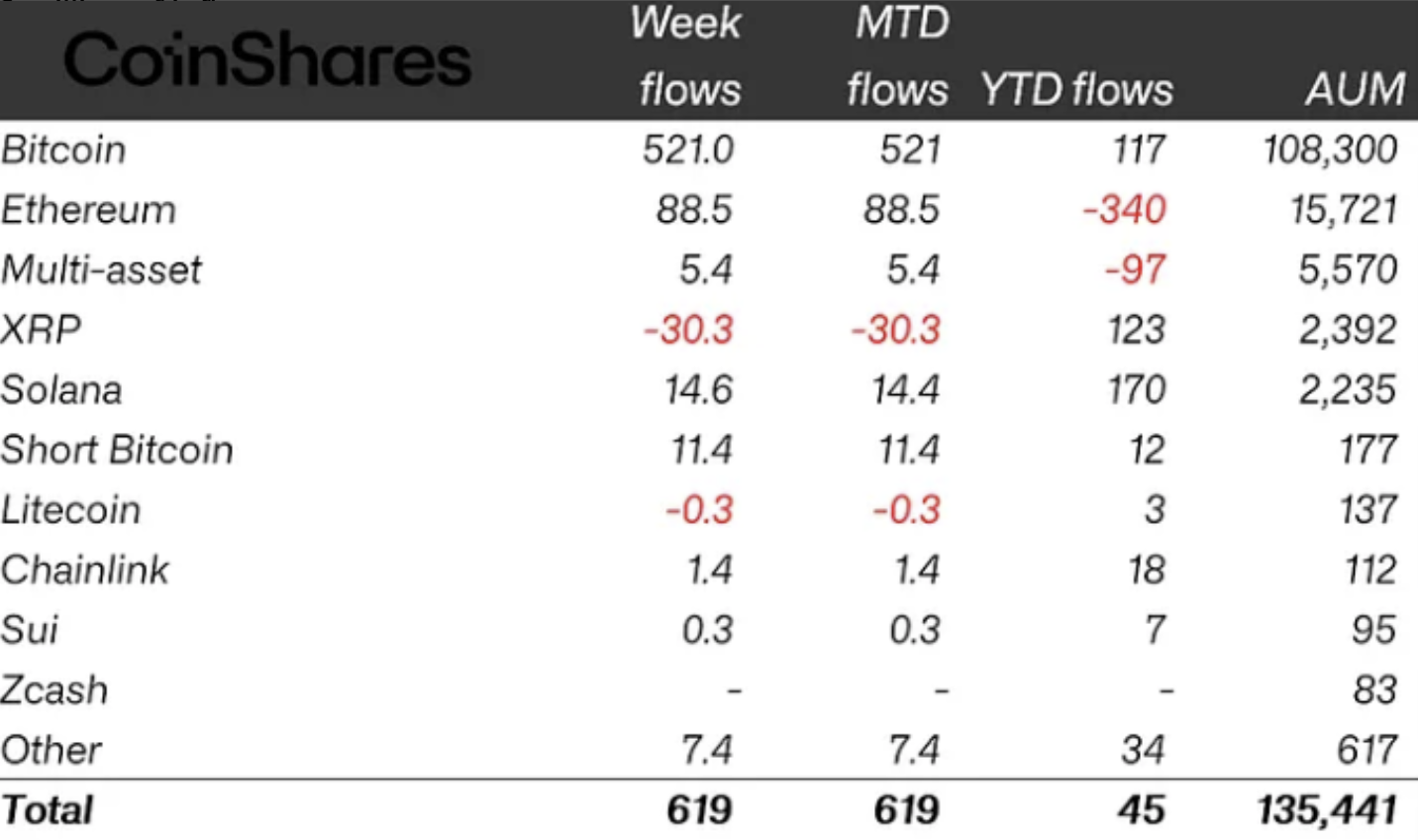 По данным аналитической компании CoinShares, объём еженедельного притока в криптовалютные биржевые продукты (ETP) составил $619 млн. Основная доля пришлась на биткоин-инструменты — $521 млн. Результат стал вторым положительным подряд после пятинедельной полосы оттока, в ходе которой рынок потерял около $4 млрд.