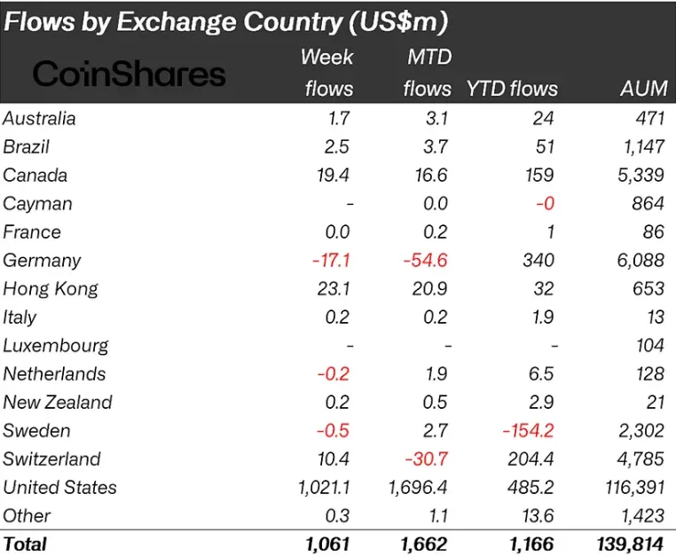 Большую часть притока (96%) обеспечили инвесторы из США. На Гонконг, Канаду и Швейцарию пришлось $23,1 млн, $19,4 млн и $10,4 млн соответственно.