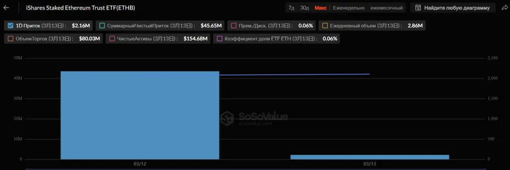В фонды на базе Ethereum поступило $315 млн. 12 марта на бирже Nasdaq стартовали торги доходным ETF на базе второй по капитализации криптовалюты от компании BlackRock. iShares Staked Ethereum Trust (ETHB) уже привлек $45,65 млн.
